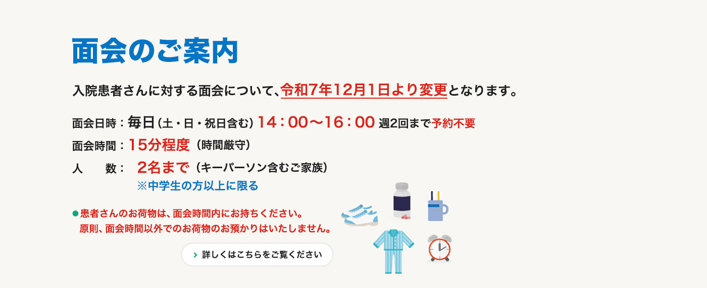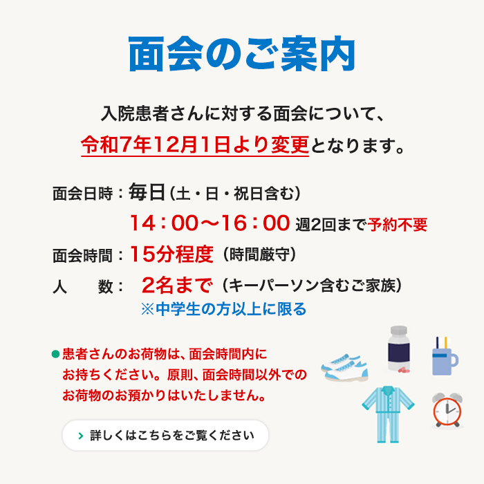 14:00~16:00(15分程度/回)週2回まで 人数:2名まで(キーパーソン含むご家族)※中学生の方以上に限る