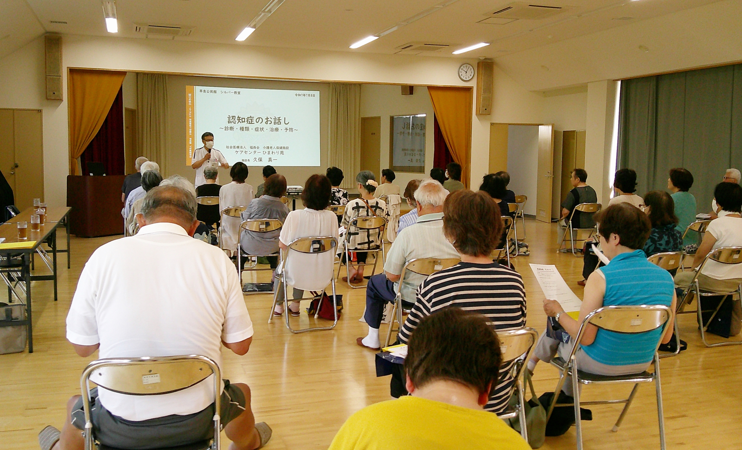 今回は「認知症について」と「骨粗鬆症にならないための運動と食事」いう2つのテーマで、福西会グループへお声をかけていただき、今回初めてケアセンターひまわり苑と合同での開催となりました。認知症のお話はケアセンターひまわり苑(介護老人保健施設)久保施設長より講演をしていただきました。