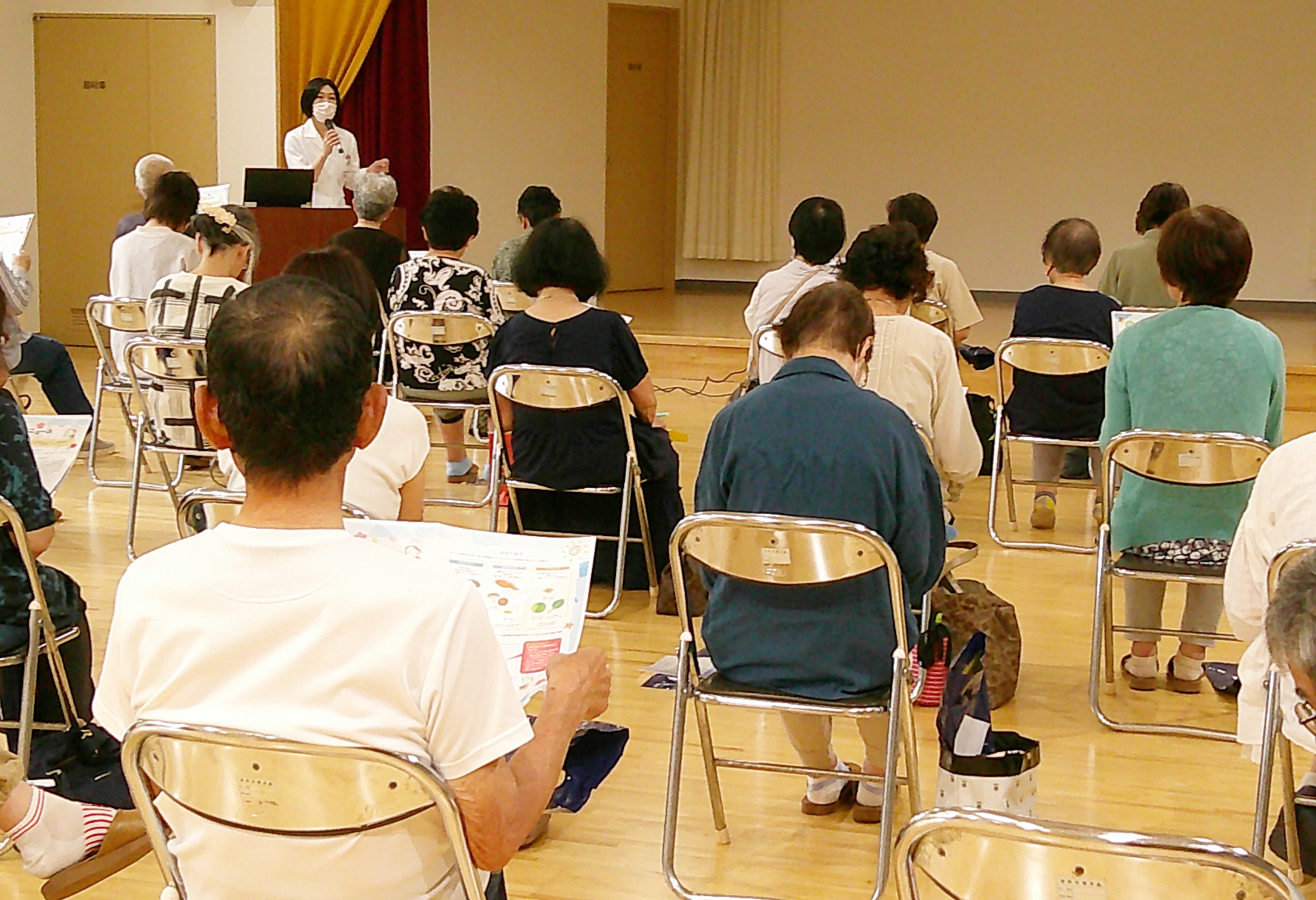 骨粗鬆症のお話は管理栄養士から具体的な献立などを交えて、理学療法士からは予防するための運動を参加していただいた皆様と一緒にいたしました。片足立ちでは、年齢よりも長くできていらっしゃる方ばかりですごいと思いました。今回貴重な教室へ呼んでいただき、ありがとうございました。地域の皆さまの健康増進に寄与できるよう、今後も活動を続けていきたいと思います。