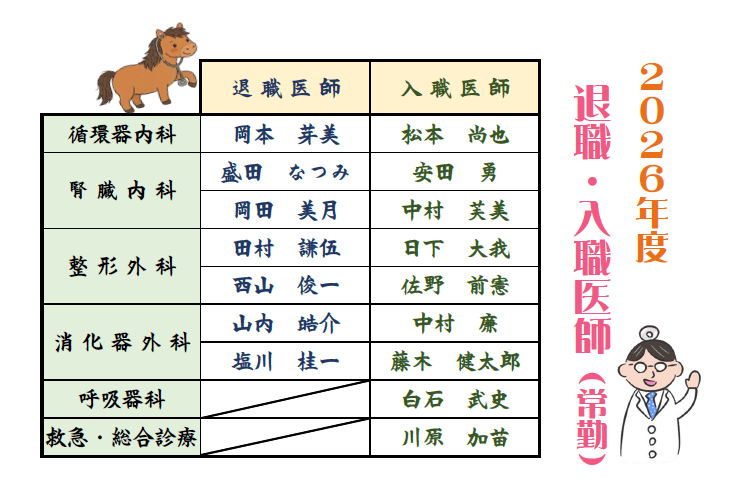 各診療科の退職医師、新入職医師に関しては下の表をご参照下さい。