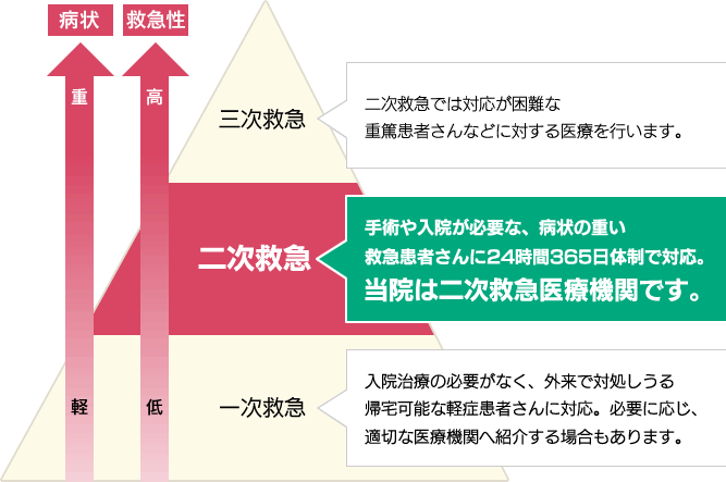時間外や休日も内科系1名、外科系1名 計2名の医師が診療にあたっています。必要な場合は専門医がオンコールですぐに病院に駆けつけ、脳卒中、心筋梗塞、外傷など、さまざまな傷病に対応しています。24時間365日、福岡市早良地区の中核病院として急性期疾患の診療・診断を担い、福岡西南部における二次救急医療の基幹病院としての役割を果たしております。