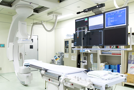 当院の血管造影装置は、FPD(フラット・パネル・ディレクター)と呼ばれる検出器を搭載しており、従来より診断能力の高い鮮明な画像を提供することが可能です。心臓血管、腹部臓器血管、四肢血管などの造影と治療が可能です。