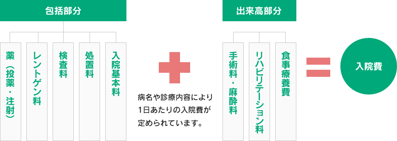 病名や診療内容により1日あたりの包括部分の入院費が決まり、包括部分の金額に出来高部分の金額を合算する計算方式です。※病名や診療内容によっては、全て出来高計算方式となる場合があります。