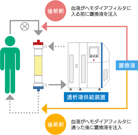 当院では通常の血液透析に加え、血液透析と血液ろかを併用した血液ろか透析(HDF)を行っております。オンラインHDFは血液透析中に大量の点滴を行い、点滴で投与された液も濾過しながら透析を行います。その効果としては、透析中の血圧安定、普通の透析では取りきれない老廃物の除去、皮膚掻痒症、レストレスレッグ症候群の改善、透析アミロイドーシスの軽減などが学会で報告されています。