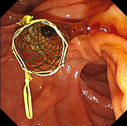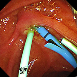 急性胆管炎の治療の際は、専用のバスケットカテーテルで総胆管内の胆汁を十二指腸や体外に排出できるようにステントを揷入留置します。