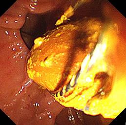 高周波電流で十二指腸乳頭部(胆管開口部)を一部凝固切開し、胆管結石を取り出します。