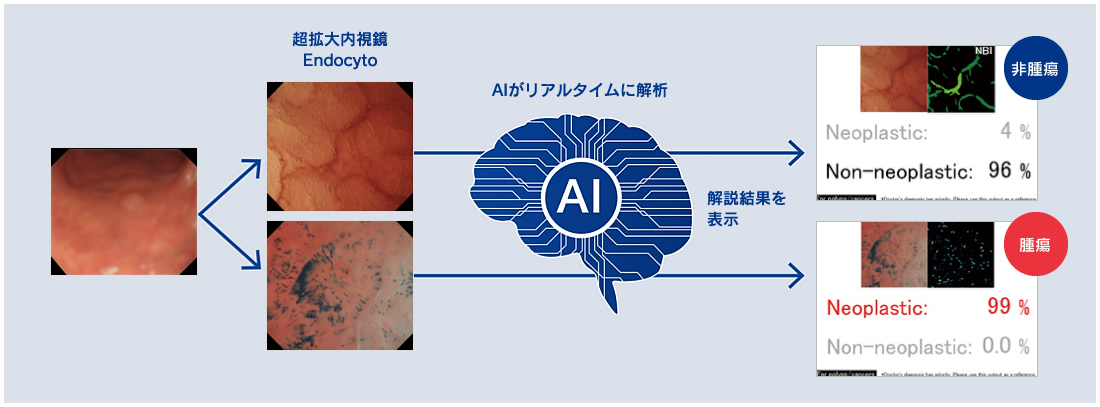 撮影された大腸の超拡大内視鏡画像をAI(人工知能)が解説し、高い診断精度で医師の診断をサポートします。