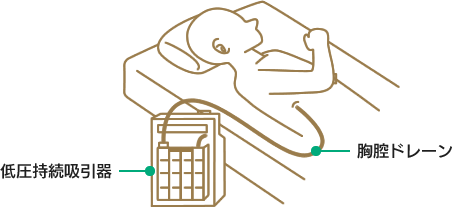 胸腔内に溜まった空気を抜いて肺を膨らませることから始まります。色々な方法がありますが、通常は、胸に空気を抜くための細いゴムホースのような管(胸腔ドレーンといいます)を挿し込み、空気を抜くための特殊な機械につないで肺を膨らませておきます。