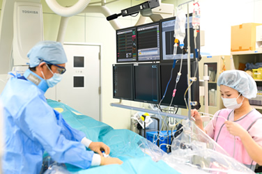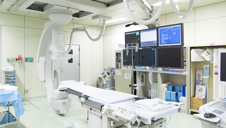 循環器科関連の検査としては、心エコー、運動負荷心電図、24時間心電図、動脈硬化検査や冠動脈CT検査などがあり、さらに当院では最低1日の入院形態をとり、安全第一を心掛けた心臓カテーテル検査や治療に取り組んでいます。カテーテル検査室や手術室で行うペースメーカー治療などはそれぞれ基準を満たしたクリーン状態で行われています。