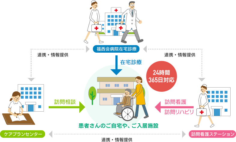 福西会病院での在宅医療のしくみをご紹介します。ご不明点などは、お電話下さい。