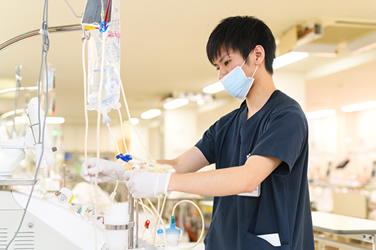 当院腎センターは50床のベットを有し、血液透析(HD)、血液透析濾過(HDF)などの血液浄化療法を中心に、穿刺や開始・回収業務および透析効率データ集計などの支援業務を行っています。また血漿交換や血漿吸着、エンドトキシン吸着、腹水濾過濃縮再静注法などの特殊な血液浄化療法にも対応しています。それに加えて透析装置の故障時にはできるだけ自分たちで対応し、透析装置のダウンタイムを短くするように努めています。