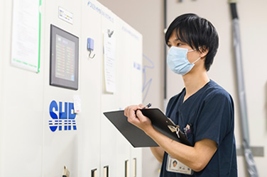 臨床工学科では、安全安心な医療が提供できるように、医師の指示のもと生命維持管理装置の操作および保守点検業務を行っています。また、患者さんに安全でより効果的な治療を提供する為に、最新の技術や知識習得に努め、常に向上心を持って業務を行っています。