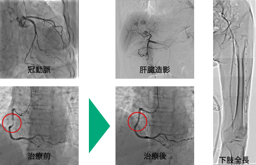 カテーテルという細い管を腕や太ももの付け根の血管から目的血管まで挿入し、造影剤を使用して撮影し必要に応じて治療まで行います。血管が狭くなったり、詰まったりしていないかなど血管自体、また血管が関与している疾患を詳しく調べ、必要があればIVRと呼ばれる血管撮影手技を応用した治療、例えば心臓の冠動脈に対するバルーン治療やステント挿入術・肝臓癌の血管塞栓術や動注療法などを行っています。