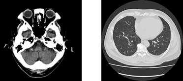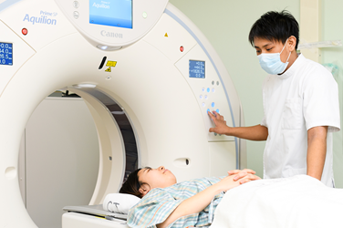 CTとは、ComputedTomography(コンピューター断層撮影)の略語です。X線を利用して、体内の情報を集め計算により人体の横断像 (輪切り)を撮影することが出来ます。検査時間は、検査の内容や部位によって異なりますが約5~20分程度の短時間ですみます。また、造影剤を使用することにより、あらゆる血管(脳・胸部・腹部・上下肢血管)や腫瘍などの撮影が可能となります。