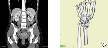 さらに、CTで収集したデータを用い画像処理ワークステーションを使用して様々な方向の断層像や、骨や血管などの3D画像を作成することも可能です。(下記の心臓CT検査やCTコロノグラフィー検査もワークステーション処理によるものです)