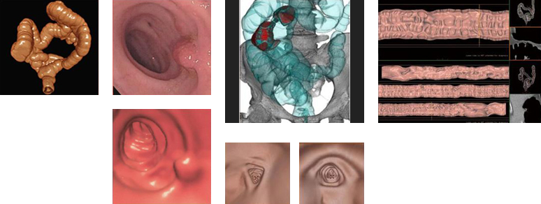 CTコロノグラフィー検査とは、CTを用いた大腸検査の総称です。拡張や鎮痙剤で腸管の蠕動運動の抑制を行い、注腸X線造影検査や大腸内視鏡と同様の前処置をしたうえで撮影し専用の大腸解析ソフトを用いて、様々な再構成画像を作成し評価します。