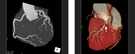当院のCTは、心臓の検査も可能です。造影剤(臓器や血管をよりわかりやすくする薬)を静脈から注射し、心臓の血管を描出して狭窄(狭くなっていないか)を見つけることができます。